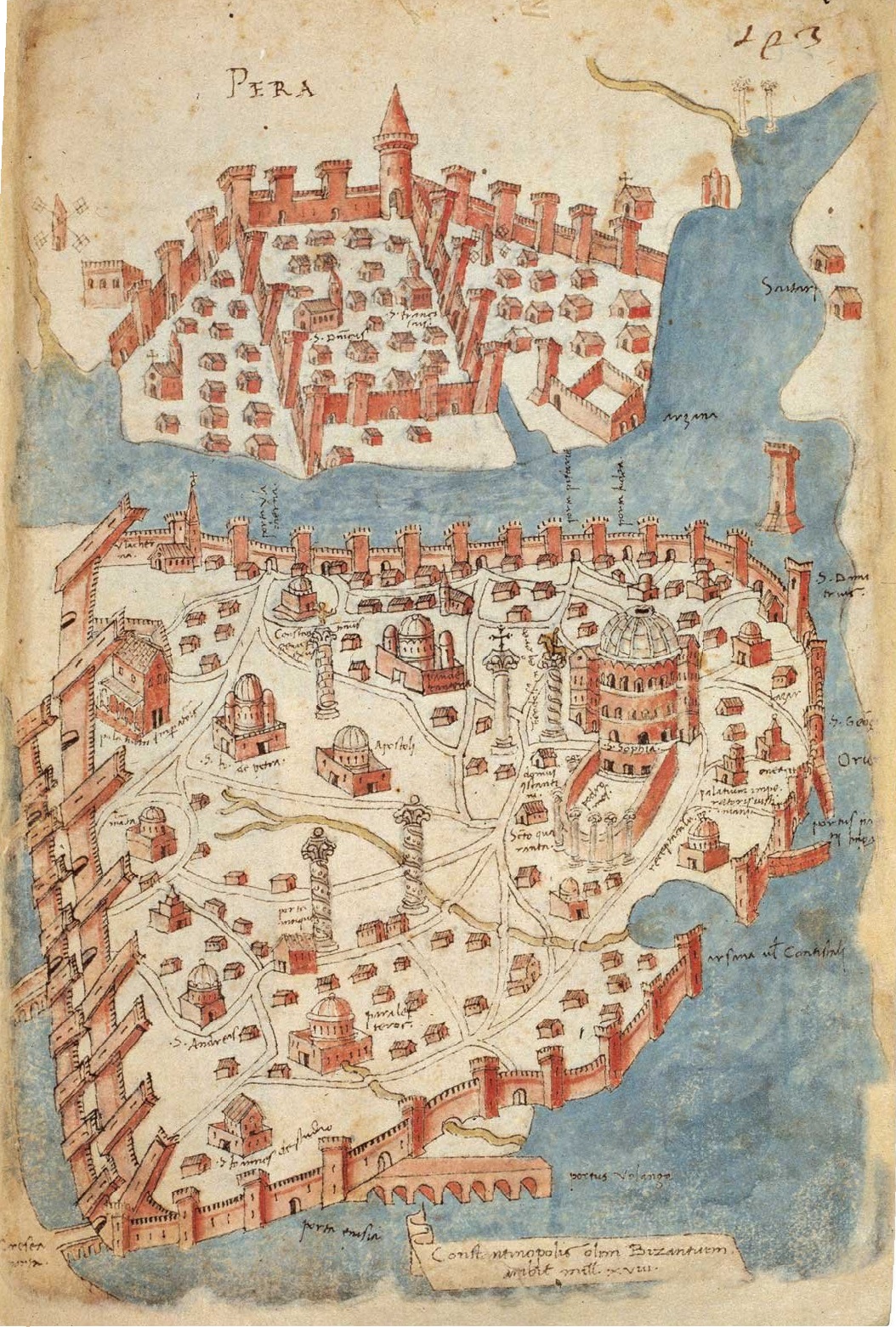 - > Fig. 13: The depiction of Constantinople by Buondelmonti (Buondelmonti, Liber insularum archipelagi, c. 1420). Biblioteca Nazionale Marciana, Ms. Lat. XIV.45 (=4595)