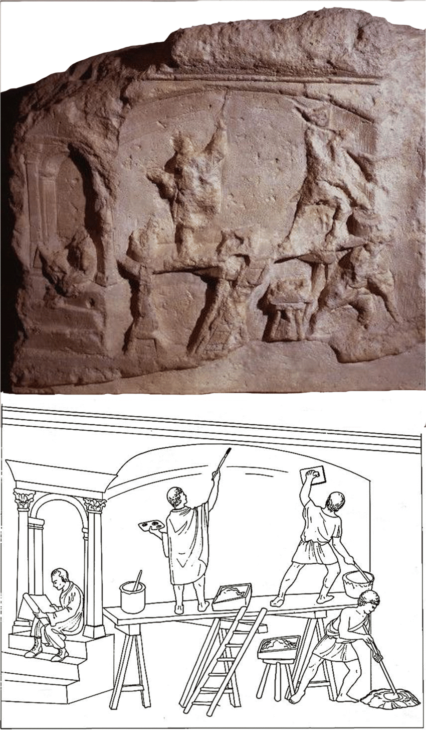 9Les sources médiévales étant muettes sur le travail sur site, imaginer le travail d’une équipe de peintres et son organisation sur le chantier nécessite de se référer aux sources antiques. Comme les fresquistes antiques, les peintres des xie-xiie siècles recourent à la technique de la fresque, qu’ils terminent sur enduit sec. En cela les contraintes matérielles et les matériaux employés sont similaires, facilitant la référence à des schémas réalisés pour les peintures domestiques antiques pour imaginer le travail d’atelier médiéval. Si les étapes de préparation du mur, inspirés de la description qu’en donne Vitruve, demeurent aux xie-xiie siècles, l’organisation type sur le chantier d’après les sources antiques est plus problématique pour la période médiévale.